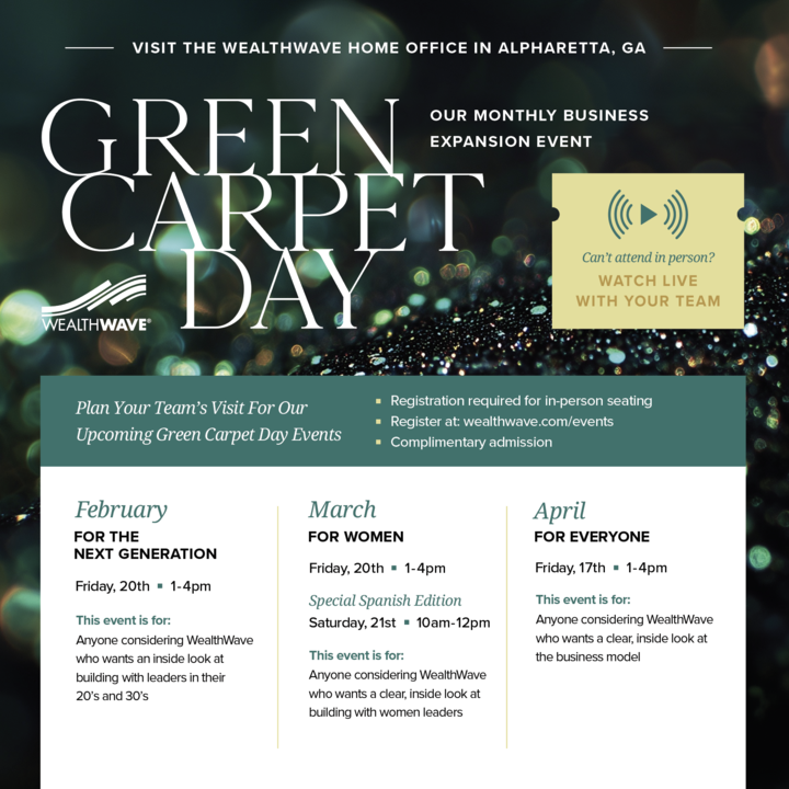 كما نعلن عن فعالياتنا الأربع المقبلة في إطار يوم السجادة الخضراء، بما في ذلك تجارب مخصصة للجيل القادم وللنساء وللجميع. تم تصميم هذه الفعاليات لتقديم نظرة من الداخل على مهمة WealthWave ونموذج أعمالها، بالإضافة إلى فرصة لبناء مسيرة مهنية موجهة نحو هدف محدد وتركز على التعليم.