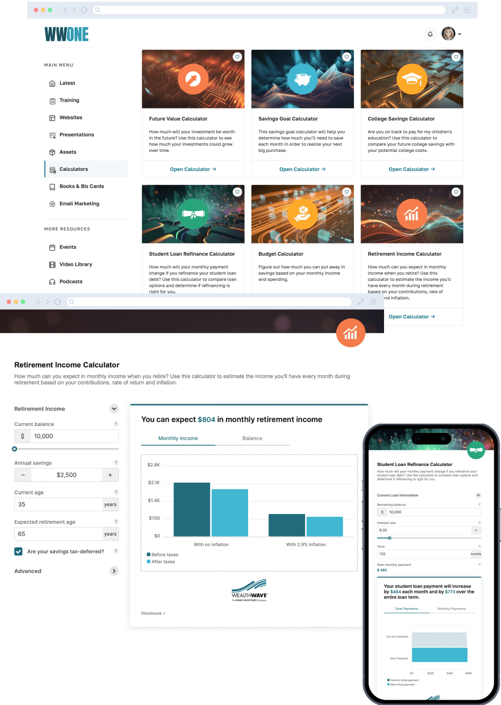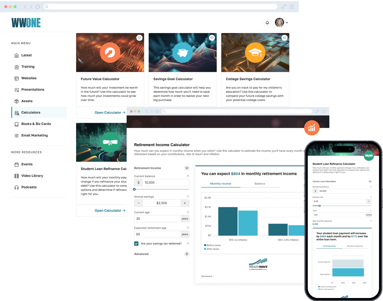 تمنحني حاسبات WWONE فائدتين رئيسيتين. إنها تخلق إلحاحًا لدى عملائي المحتملين بأنهم بحاجة إلى اتخاذ قرار مالي لتغيير مسارهم الحالي. كما أنها تمنحني الفرصة لتثقيفهم حول كيف يمكن لمنتجاتنا وخدماتنا أن تساعدهم على إجراء هذا التغيير.
