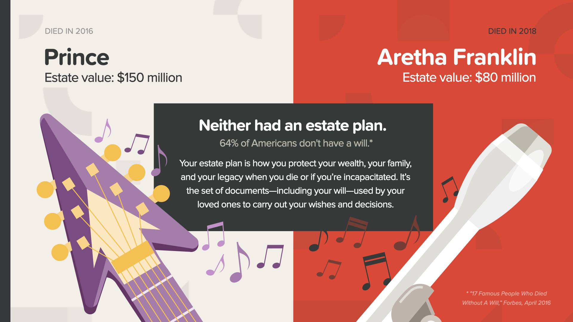 كان لدى كل من برنس وأريثا فرانكلين، اللذان توفيا قبل بضع سنوات فقط، عقارات كبيرة - ولكن لم يكن لدى أي منهما خطة تركة. وقد ترك كلاهما لعائلتيهما وشركائهما في العمل فوضى عاطفية ومالية وقانونية استغرقت سنوات لتسويتها. وهذا يدل على مدى أهمية حماية ثروتك من خلال خطة تركة. ووفقاً لاستطلاع أجرته RocketLaw، فإن 64% من الأمريكيين ليس لديهم وصية. وليس من المستغرب أن يكون الرقم أعلى بالنسبة للأمريكيين الأصغر سناً (70% من الذين تتراوح أعمارهم بين 45 و54 عاماً) مقارنة بالأمريكيين الأكبر سناً (54% من الذين تتراوح أعمارهم بين 55 و64 عاماً) ليس لديهم وصية. كان برنس 57% فقط.